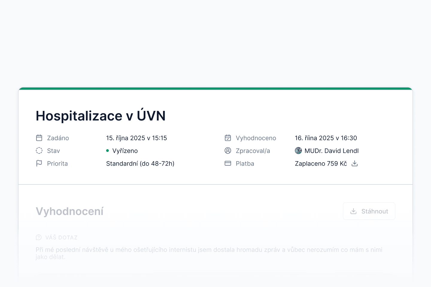 V hlavičce najdete informace o vašem vyhodnocení jako jméno lékaře, který ho zpracoval, stav či data, kdy bylo zadáno a vyhodnoceno