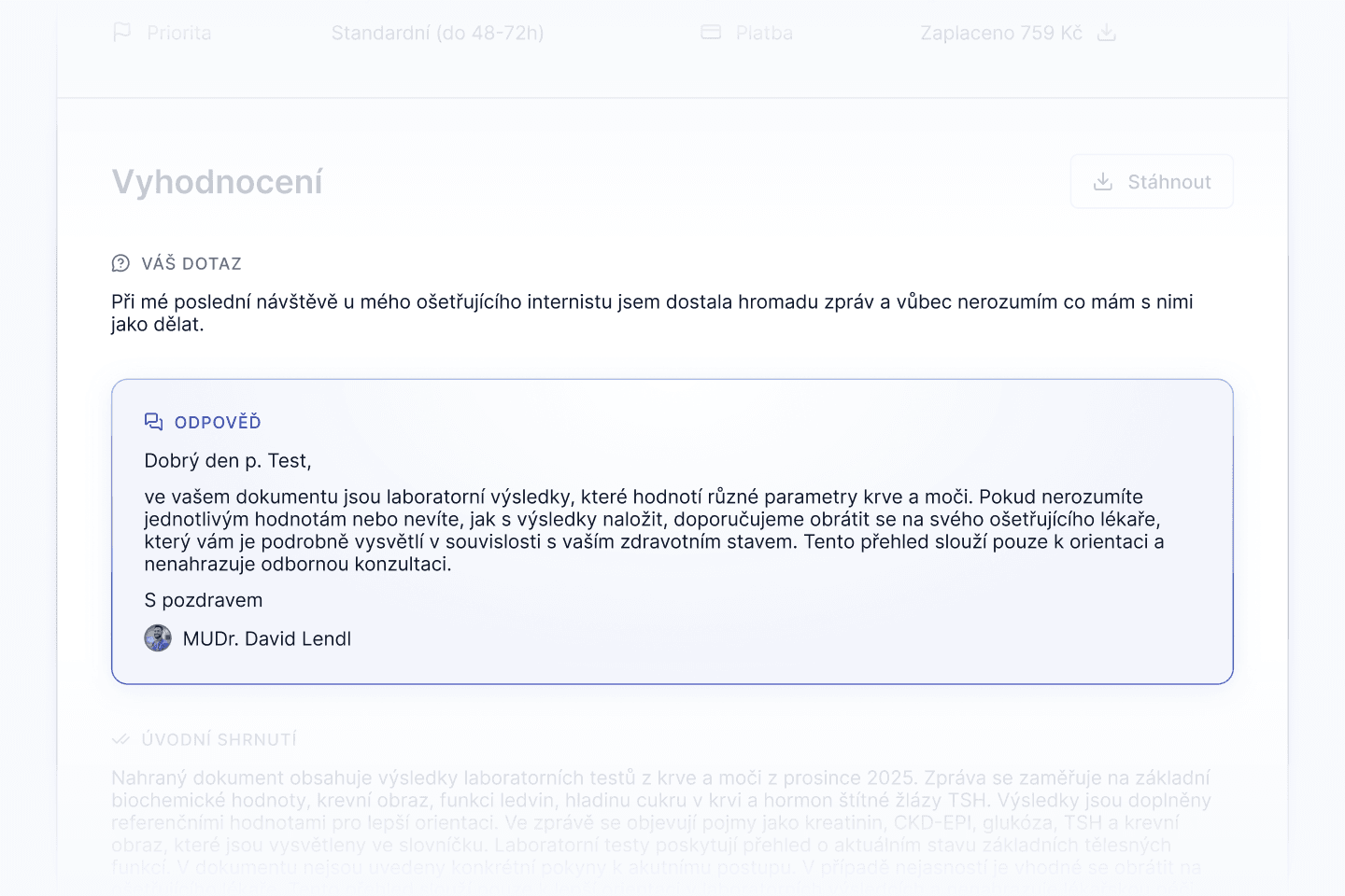 Kontaktovat podporuKaždý výsledek posuzuje lékař s platnou registrací u České Lékařské Komory. Standardní vyhodnocení je do 48 hodin, prioritní do 24 hodin.